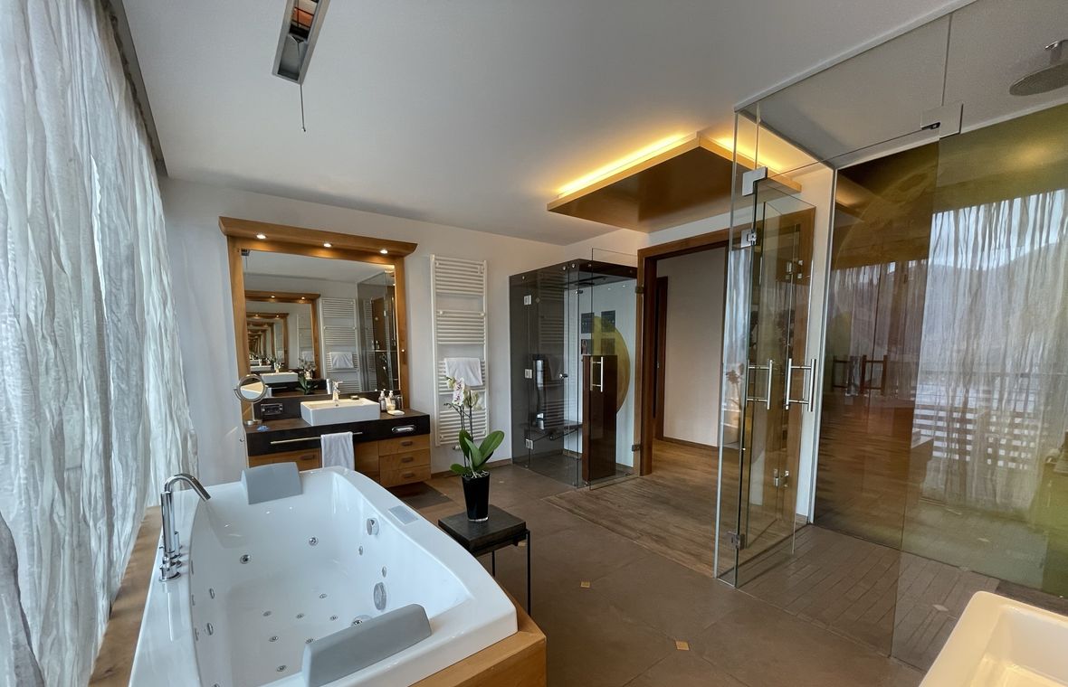 Panorama Villa mit 75 m² & Glasfassade mit Balkon über die gesamte Ost-SüdfassadeWohnraum sowie abtrennbares ZusatzzimmerDrehbares Rundbett, begehbarer Kleiderschrank, Klimaanlage, 2x TV, Minibar, Whirlwanne & begehbare Dusche mit Regenfall, Infrarotsauna, Pissoir, Bidet, WC getrennt