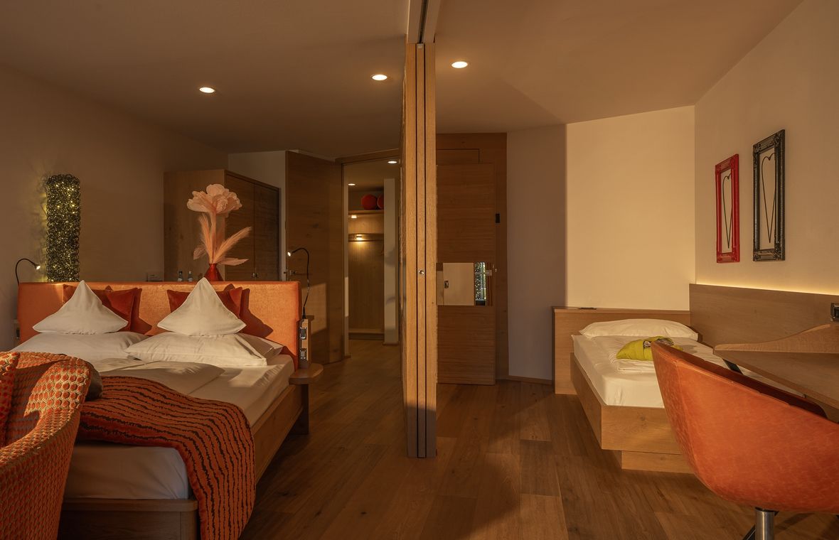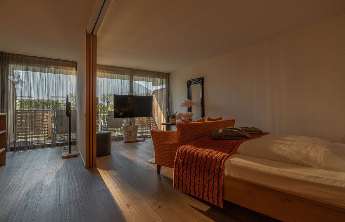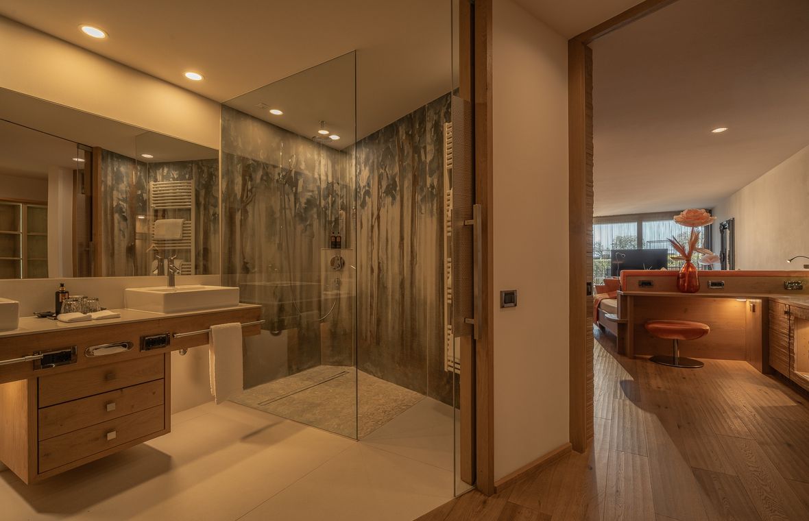 Room ParcoDouble room with 49 m² & separable additional room, balcony with view and access to the gardenWalk-in closet, 2x flat screen TV, minibar, air conditioning, shower, bathtub, bidet, separate toiletfrom € 287,— per person, including wellness full boardCheck availabilities With best priceInquire room