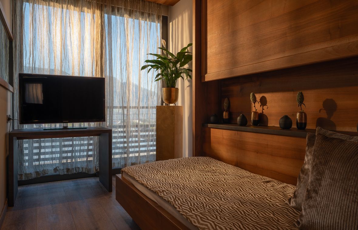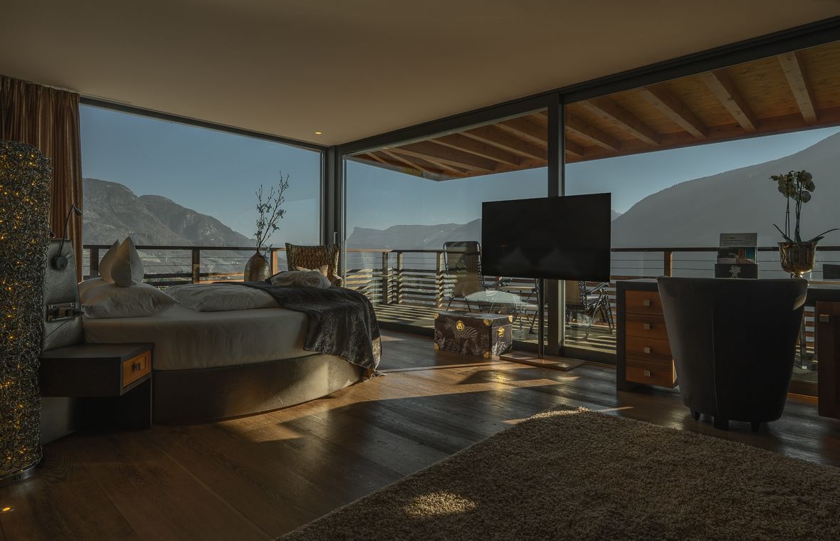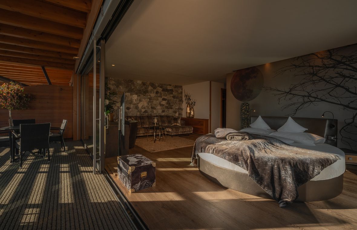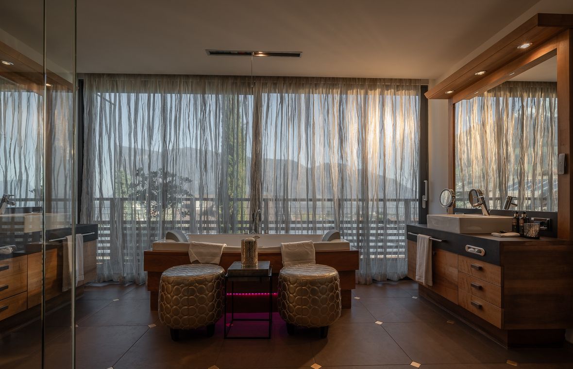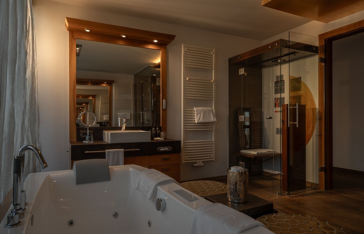Letto rotondo girevole, cabina armadio, aria condizionata, 2x TV, minibar, vasca idromassaggio e cabina doccia, sauna a infrarossi, pissoir, bidet, wc separato